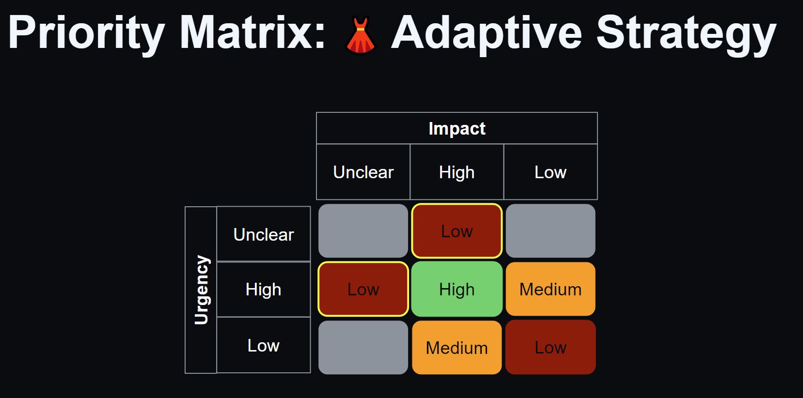In the Adaptive Strategy of for example a fashion company, factors like seasonality and changing consumer preferences make your context more unpredictable. You’d probably be willing to prioritize items that are unclear in terms of either Impact OR Urgency. Maybe not items that are unclear in both Impact and Urgency, but at least one of them. If you don’t know what impact something has but you have top-down “High” urgency, you’ll prioritize it. Likewise, if you don’t know how much time you have to deliver on something but you know it has a “High” impact, you’ll consider it for prioritization.