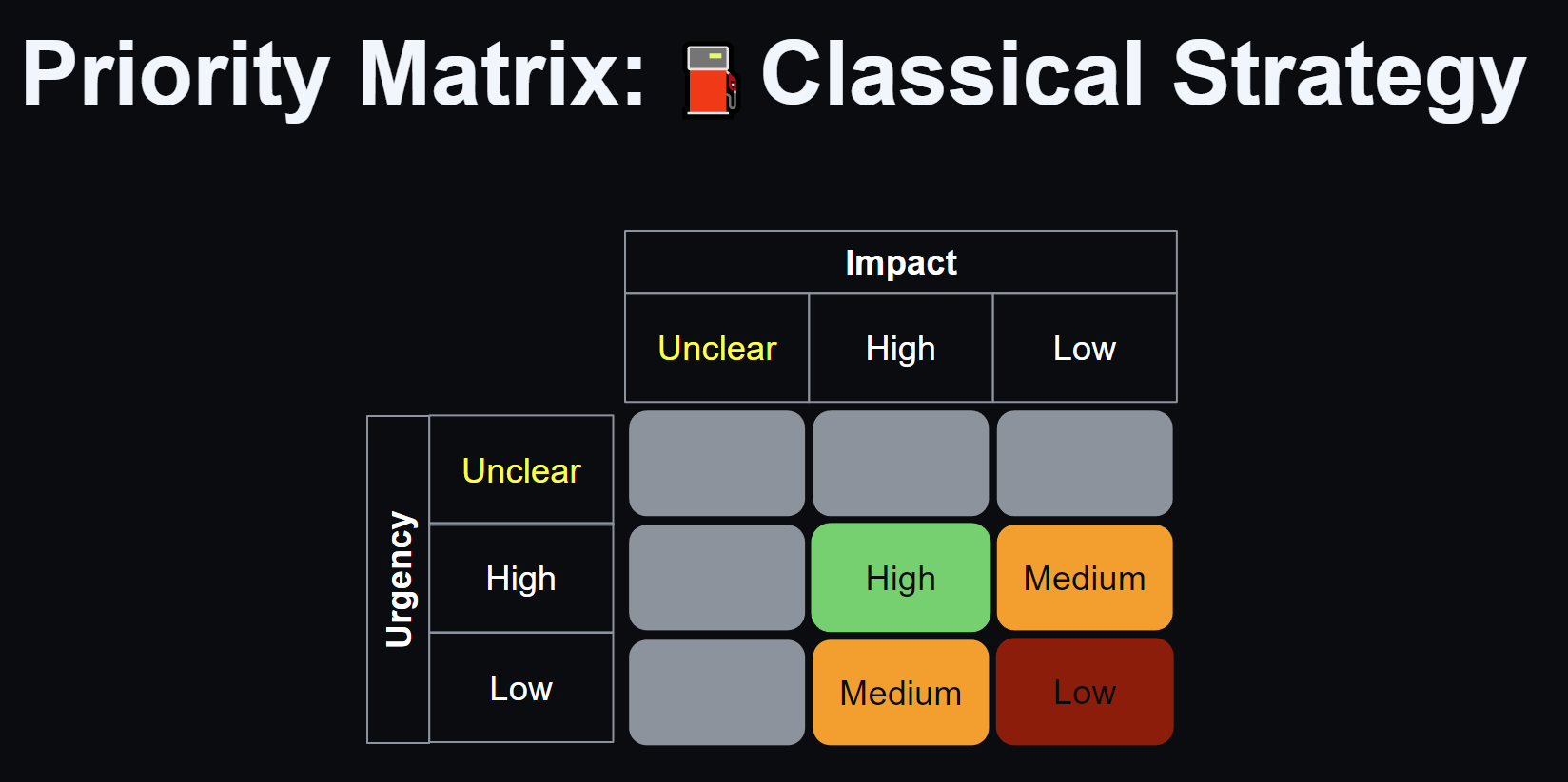 For example, in the Classical Strategy of an oil & gas company, you’d probably not consider prioritizing items that are unclear in terms of Impact and/or Urgency. You’d probably just keep doing what you are doing, and not take any risks. Top-down prioritization is the way to go, and clear direction oftentimes will exist.