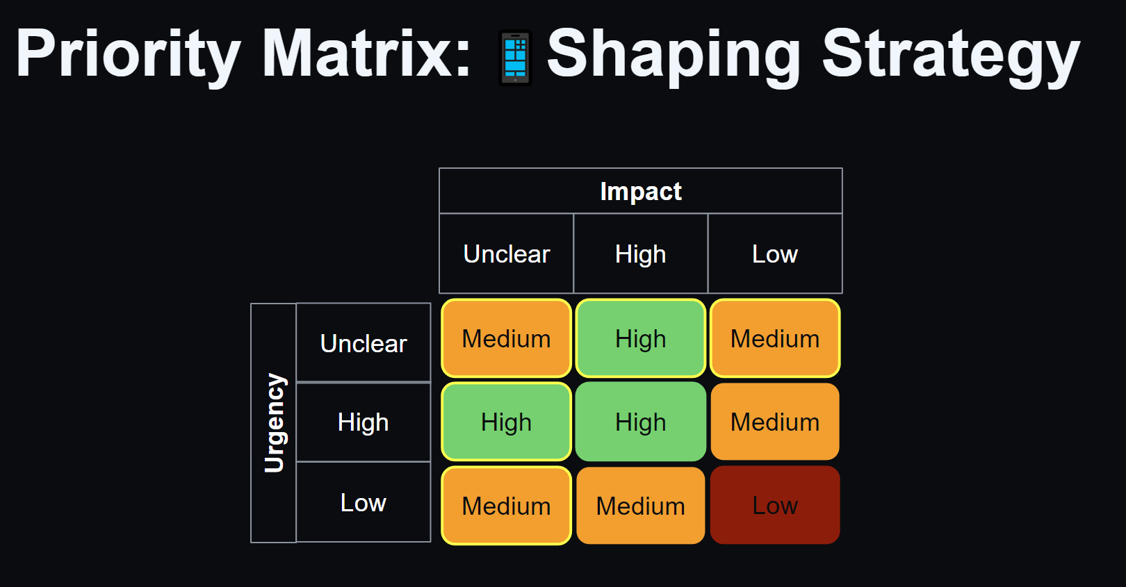 And finally we arrive at the Shaping Strategy where there is both a high sense of unpredictability, and opportunity for industry malleability. Here the argument can be made that even though the Urgency is unclear, you’d still want to prioritize items that have a “High” expected impact. Likewise, even though the Impact is unclear, you’d still want to prioritize items that have a “High” expected urgency. This is because the context is so unpredictable and malleable that you’d want to take as much risk as possible in setting your priorities.