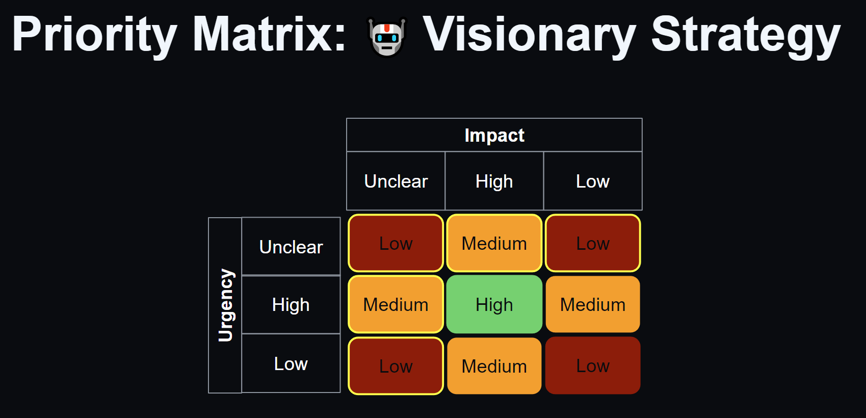 As we then move to the Visionary Strategy of a tech company, we are dealing with a context that is both predictable and malleable. Items that are unclear in terms of Impact and Urgency are probably the ones that you’d still want to prioritize. In fact; items that have a “High” expected impact but are unclear in terms of Urgency are probably ones you’d still want to prioritize. “We don’t know how much time we have to deliver on this, but we know it has a high impact, so let’s prioritize it!”. Top-down direction can be much less clear, simply because the context is more unpredictable and malleable.