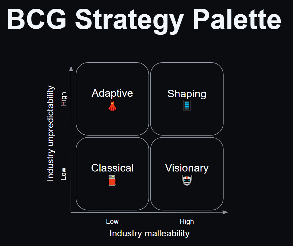 This is a very short description of the tool. BCG published an excellent book on the topic that I highly recommend: The book is called Your Strategy Needs a Strategy, and explains this concept in much more detail.