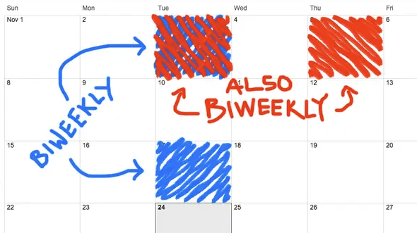 This means that in all practical sense we do not get to communicate in a synchronous way at all. It just isn’t practical. We only have one team meeting that is recorded and optional, and it happens once every 2 weeks. (while we are on the topic: PLEASE stop using the confusing term biweekly!)